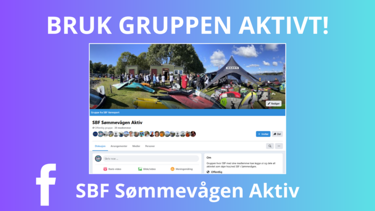 Egen gruppe for alle som er aktive på brett i Sømmevågen. Bruk denne gruppen til å dele informasjon om ting som skjer i Sømmevågen, om du ønsker å finne andre å seile/winge/padle/annet sammen med. Hva som helst – for å skape mer aktivitet i Sømmevågen og ha det gøy sammen med andre. Opprett gjerne eget arrangement i gruppen om du ønsker å få andre med på en aktivitet.